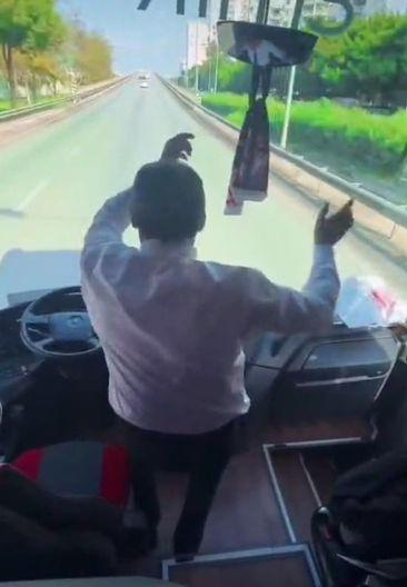 Tümosan Konyaspor-Antalyaspor deplasmanına giden Antalyaspor taraftarını taşıyan otobüs şoförünün, seyir sırasında koltuğundan kalkarak taraftar grubuyla birlikte oynadığı görüldü.
